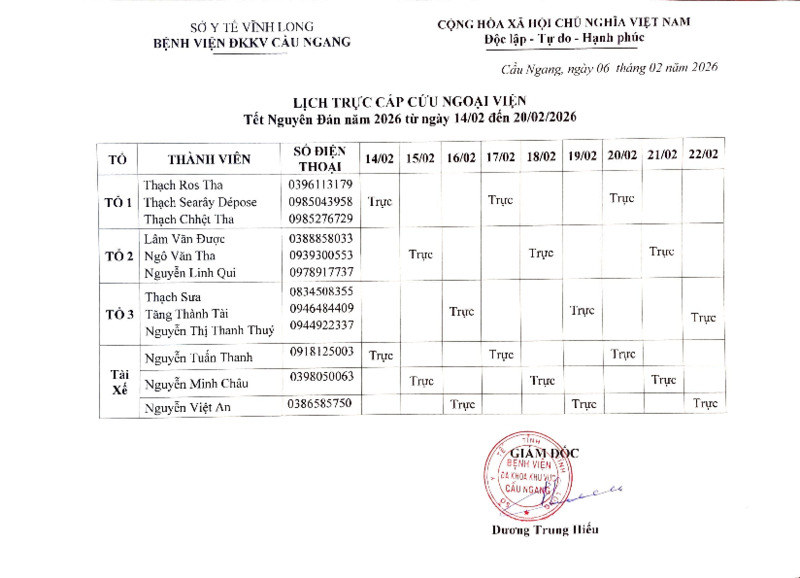 | Tiêu đề văn bản | Thông báo lịch trực tết nguyên đán và lịch trực cấp cứu ngoại viện năm 2026 | ||