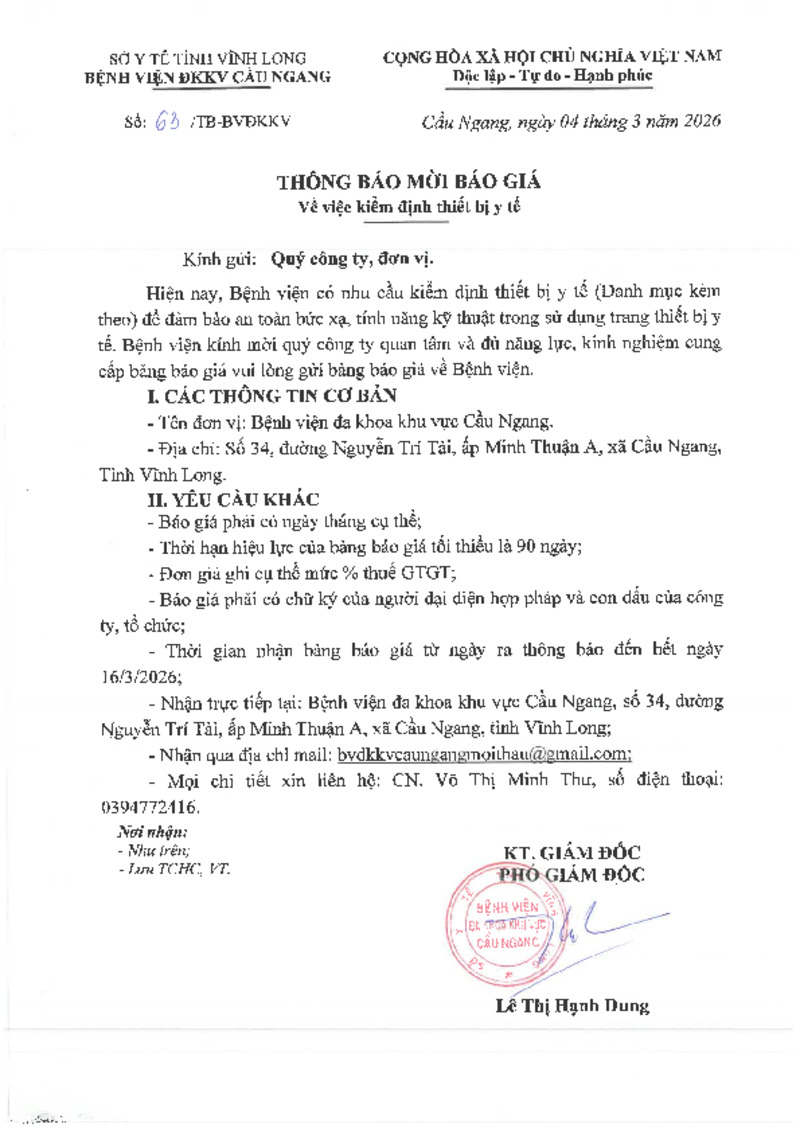 | Tiêu đề văn bản | THÔNG BÁO MỜI BÁO GIÁ Về việc kiểm định thiết bị y tế | ||