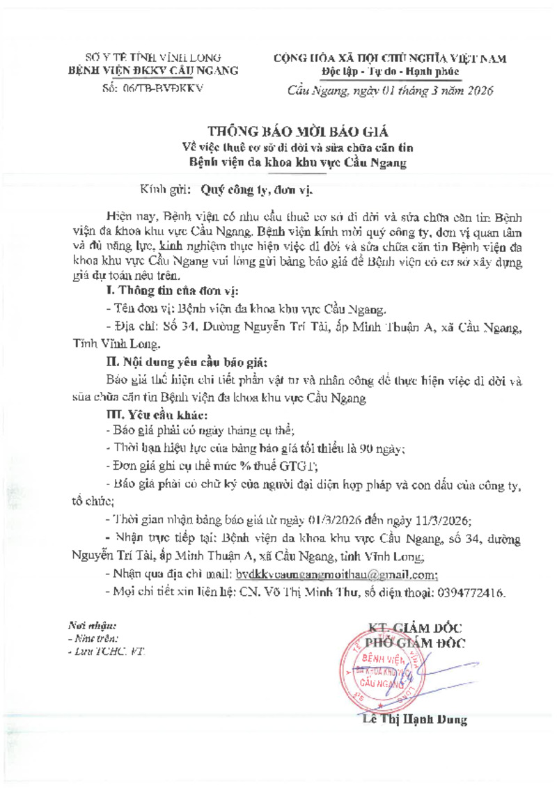 - Thời gian nhận bảng báo giá từ ngày 01/3/2026 đến ngày 11/3/2026;