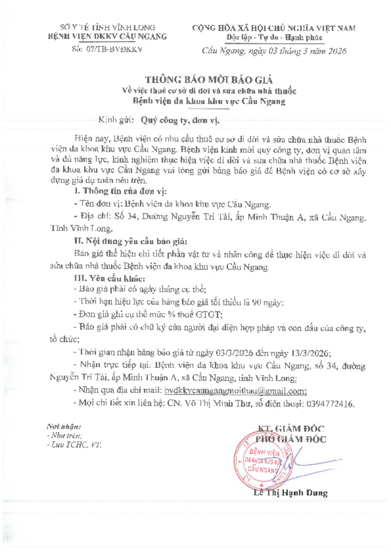 - Thời gian nhận bảng báo giá từ ngày 03/3/2026 đến ngày 13/3/2026;