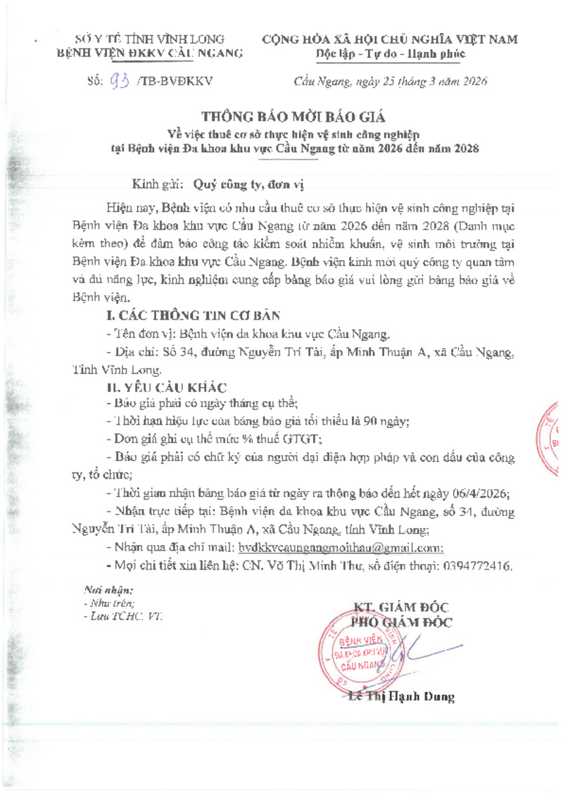 - Thời gian nhận bảng báo giá từ ngày ra thông báo đến hết ngày 06/4/2026;