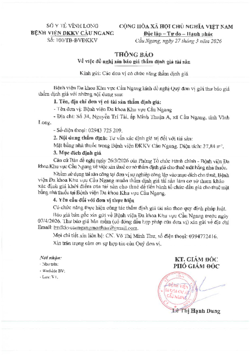 | Tiêu đề văn bản | THÔNG BÁO Về việc đề nghị xin báo giá thẩm định giá tài sản | ||