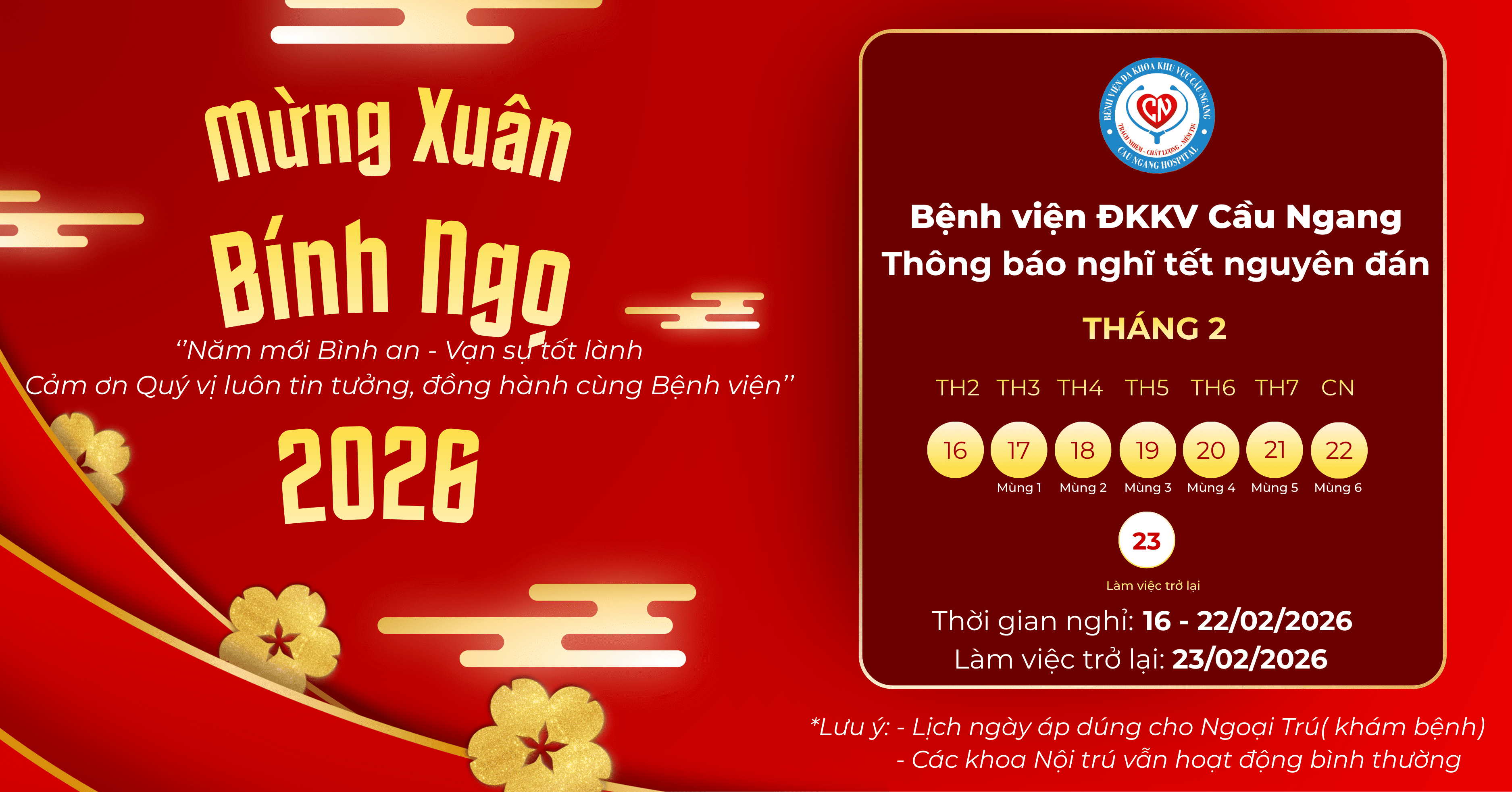 📅 Thời gian nghỉ: Từ Thứ Hai (16/02/2026) đến hết Chủ Nhật (22/02/2026). 🏥 Thời gian làm việc trở lại: Thứ Hai (23/02/2026).